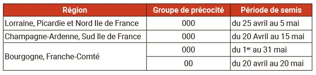 Dans les régions du Nord-Est, les variétés des groupes 00 et 000 sont les plus adaptées, avec une période optimale de semis se situant entre le 20 avril et le 31 mai (voir tableau).