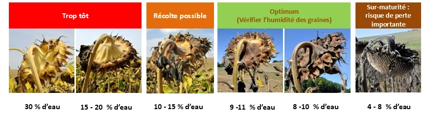 L’observation des plantes est indispensable pour déterminer le stade optimal. Le dos du capitule vire du jaune au brun, les feuilles sont toutes sénescentes (quelques feuilles hautes peuvent encore être vertes), la tige se dessèche et prend une couleur beige clair.