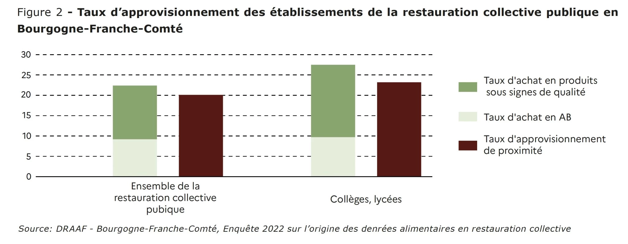 Depuis 2018, la loi Égalim 1 s’est fixée comme objectif de favoriser une alimentation « saine, sûre et durable pour tous » en restauration collective publique. Cela repose notamment sur un objectif d’atteindre 50 % de produits durables ou sous Signe d’origine et de qualité (Siqo), dont au moins 20 % de produits bios dans les montants d’achats de denrées, à partir du 1er janvier 2022. Au sein du Programme national pour l’alimentation, la restauration collective publique est considérée comme un levier pour la transition agricole et alimentaire, en raison de sa puissance d’achat. Par exemple, en 2021, la Direction régionale de l’alimentation, de l’agriculture et de la forêt (Draaf) de Bourgogne Franche-Comté (BFC) a réalisé une enquête montrant que les établissements de restauration collective régionaux ont servi 113,2 millions de repas pour un montant d’achat de denrées alimentaires estimé à 246 millions d’euros TTC. Au sein de ce secteur, les établissements d’enseignement représentent 51 % des repas service en BFC (environ 58 millions de repas). Le coût moyen estimé de la matière première par repas, en BFC était, en 2021, de 2,18 euros.