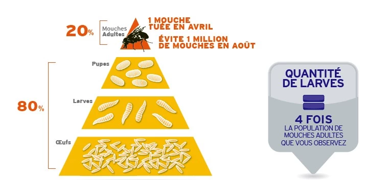 Pour une lutte efficace, il faut combiner un traitement larvicide et un traitement adulticide. Les mouches adultes ne sont que la partie visible de l’infestation, les larves et pupes représentent 80 % de leur population active. Afin de limiter les populations de mouches, l’utilisation de larvicides est donc primordiale. Ce sont des inhibiteurs de croissance. Ils bloquent la synthèse de la cuticule lors des phases d’évolution larvaires et empêchent la formation des pupes. Ils doivent être appliqués sur les litières, les fumières, les fosses à lisier en privilégiant les zones non piétinées par les animaux (sous les abreuvoirs, les auges…). Ce traitement est à réaliser toutes les 4 semaines en respectant strictement les doses et le mode préparatoire des produits.