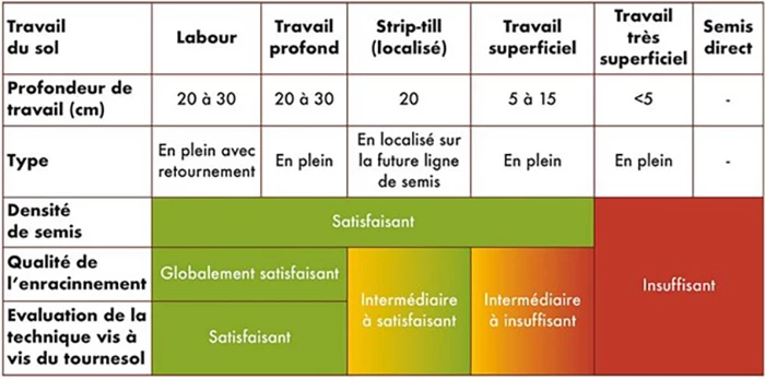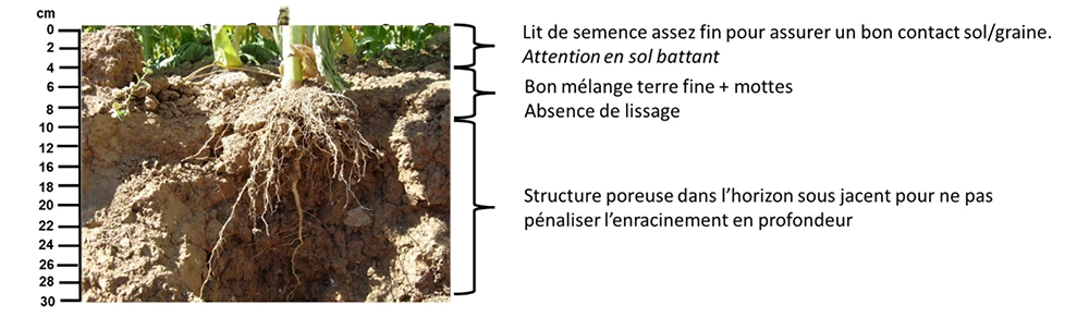 Le tournesol est une plante à pivot et à cycle court, ce qui rend cette culture très exigeante vis-à-vis de la qualité d’implantation, notamment pour assurer l’installation du peuplement et mieux supporter les périodes de stress hydrique par un bon enracinement. Tout défaut d’enracinement entraîne une perte de rendement (jusqu’à 10 q/ha) et de qualité (pourcentage d’huile).