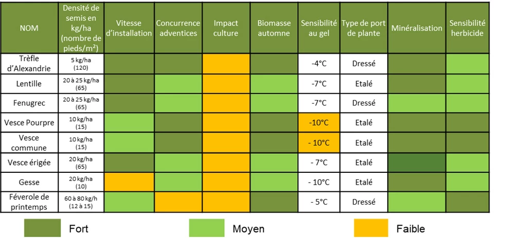 Les légumineuses sont privilégiées en raison de leur phase de croissance active décalée (500 à 700 °C base 0 depuis la levée) par rapport au colza (400 °C base 0 depuis la levée). Cela permet au colza de s’installer avant que les légumineuses ne commencent à croître significativement, favorisant ainsi le colza dans des conditions hydriques contraignantes.