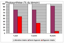 Sur le graphique 2, nous remarquons que les situations d’hydromorphie modérée (semi-hypoxie) ont un faible impact sur la photosynthèse. Par contre, les situations d’hydromorphie importante (hypoxie totale = ennoiement) impactent fortement la photosynthèse.