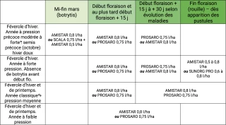 Les attaques de botrytis sont d’autant plus difficiles à gérer, qu’elles ne sont pas prises aussitôt l’apparition des symptômes. Dès la mi-mars, si les symptômes apparaissent, une première intervention à base de Scala 0,75 l/ha + Amistar 0,5 l/ha est à réaliser. Il s’agit de situations à forte pression. Une seconde intervention d’Amistar peut-être réalisée à partir du début floraison. Une troisième application pourra être réalisée entre floraison + 15 j et la fin floraison pour gérer les premières attaques de rouille et compléter le programme sur botrytis.