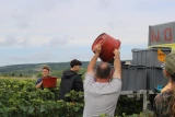 Après une première coupe, Thibault charge le camion en compagnie des 25 coupeurs, avant d'aller tout livrer au chai. Les grappes sont déposées sur le tapis avant d'atterrir à la vessie. « L'état sanitaire me paraît satisfait », confie Aurélie, en touchant les grappes, avant d'ajouter, en goûtant, que « l'acidité des raisins me paraît normale ». Menacée par la pluie dès cette fin de semaine, Aurélie témoigne son inquiétude, « nous avons peur que la pourriture s'installe, nous avons constaté quelques foyers, donc nous nous empêchons de récolter pour éviter des dégâts », manifeste-t-elle. En contrat avec une dizaine de vendangeurs depuis quelques années, elle assure cependant une certaine assurance, « nous avons confiance en eux, on sait qu'ils font du bon boulot. Pour les crémants, c'est plus technique, on doit respecter le cahier des charges, et donc toute la vendange est 100 % manuelle », déclare Aurélie. Cette récolte se distingue également des vins tranquilles, car « la vinification est gérée par un prestataire. Nous assurons cependant, la vinification du reste de nos récoltes, c'est-à-dire des vins tranquilles », ajoute-t-elle. D'ici trois jours, le domaine Giraudon passera à la vendange des vins tranquilles. Ce jeudi 28 août, la viticultrice prend du recul sur les années passées, « depuis une quinzaine d'années, on se rend compte qu'on commence de plus en plus tôt. On sait que c'est forcément lié au changement climatique. On s'adapte, mais ça rend nos récoltes de plus en plus incertaines. On espère avoir une bonne récolte cette année, on n'a tous les feux au vert en tout cas », confie-t-elle, en touchant du bois.