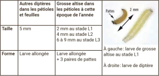 La période de surveillance via les tests Berlèse doit débuter à partir de maintenant. Ces premières mesures fourniront un début d’estimation quant à la quantité de larves d’altises présentes cette campagne. Compte tenu de la persistance du vol des adultes sur certains secteurs, des émergences échelonnées sont à prévoir. Il est donc fortement recommandé de refaire un test Berlèse deux à trois semaines plus tard. Rendez-vous sur le site de Terres Inovia pour voir comment réaliser un test Berlèse. Attention, toutefois, à ne pas confondre les larves (voir tableau 1).