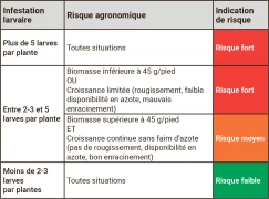 Attachez une réelle importance aux fortes infestations conjuguées à un risque agronomique élevé (petit colza, faim d’azote, pivots défectueux, reprises tardives, etc.), les dégâts sont généralement plus sévères (seuil à 3 larves par plante).