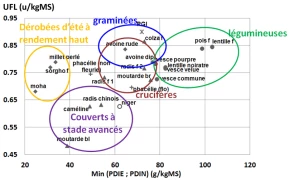 Les couverts semés en août et exploités en novembre présentent des valeurs nutritives élevées lorsqu’ils sont exploités avant les stades floraison ou épiaison, dépassant 0,75 UFL/kg MS de teneur en énergie et 100 g de PDIN/kg MS. Avec 111 g PDIE/UFL et 195 g PDIN/UFL en moyenne pour les espèces étudiées, les légumineuses confirment leur intérêt pour apporter des protéines digestibles à moindre coût. Avec 85 g PDIE/UFL, les crucifères exploitées avant floraison présentent un bon équilibre de valeurs énergétiques et azotées. (Voir graphique)